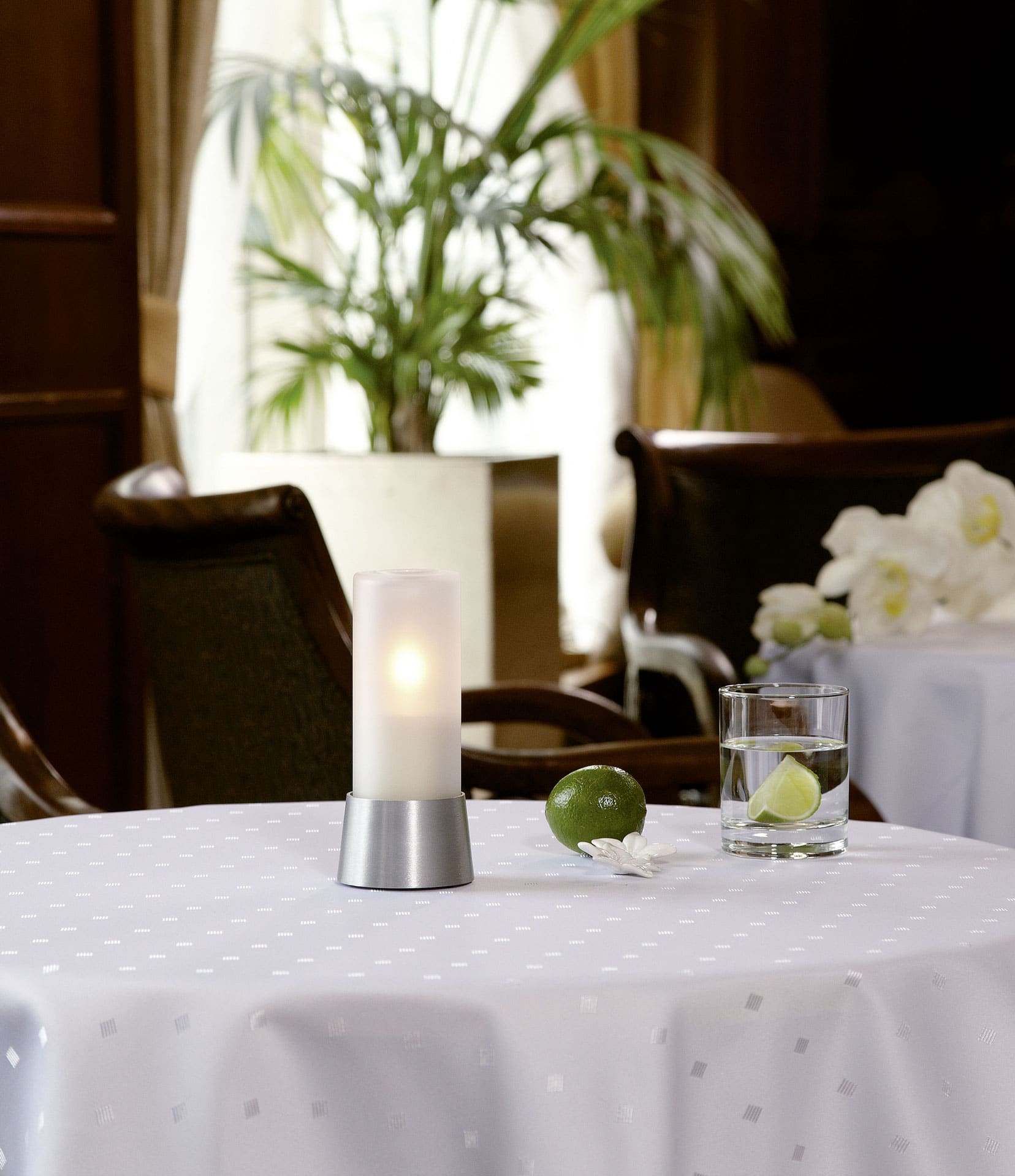 Coco impresses with its simplicity. The matt surface makes it easier to combine at the table – decorative elements simply combine – a stylish whole is created. Colored glasses come into their own with her. Choose between a base in matt brass or nickel.